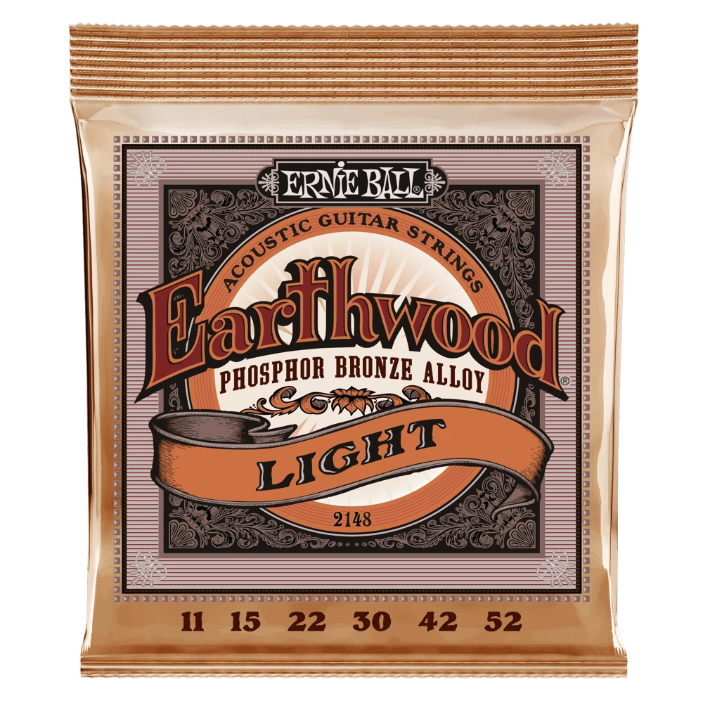 Ernie Ball Earthwood Phosphor Bronze Acoustic Guitar Strings are made from 92% copper, 7.7% tin, 0.3% phosphorus wire wrapped around tin plated hex shaped steel core wire. These guitar strings have a light orange, gold color and provide a mellow, ringing sound, with excellent clarity. Gauges .011, .015, .022w, .030, .042, .052