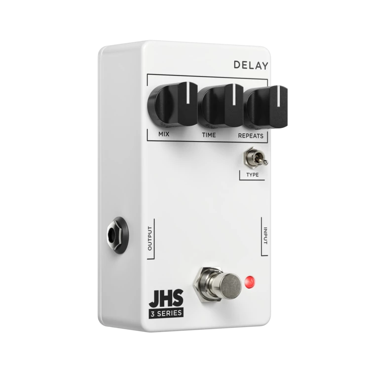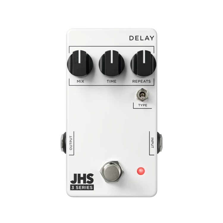 The JHS Pedals 3 Series Delay lets you choose between rich and warm or clear and pristine echoes. The straightforward design is simple and easy to use while offering a huge range of options. The Delay gives you 80ms to 800ms of delay time, for everything from slapback to long ambient washes of pad-like echo. The Type toggle allows you to select between a clearer digital-voiced delay and darker analog-voiced delay. The Delay will give you classic bucket brigade runaway when you max out the Repeats knob when in the analog-voiced delay mode. The JHS Pedals 3 Series Delay runs on 9V DC Negative Center power and consumes 71mA.