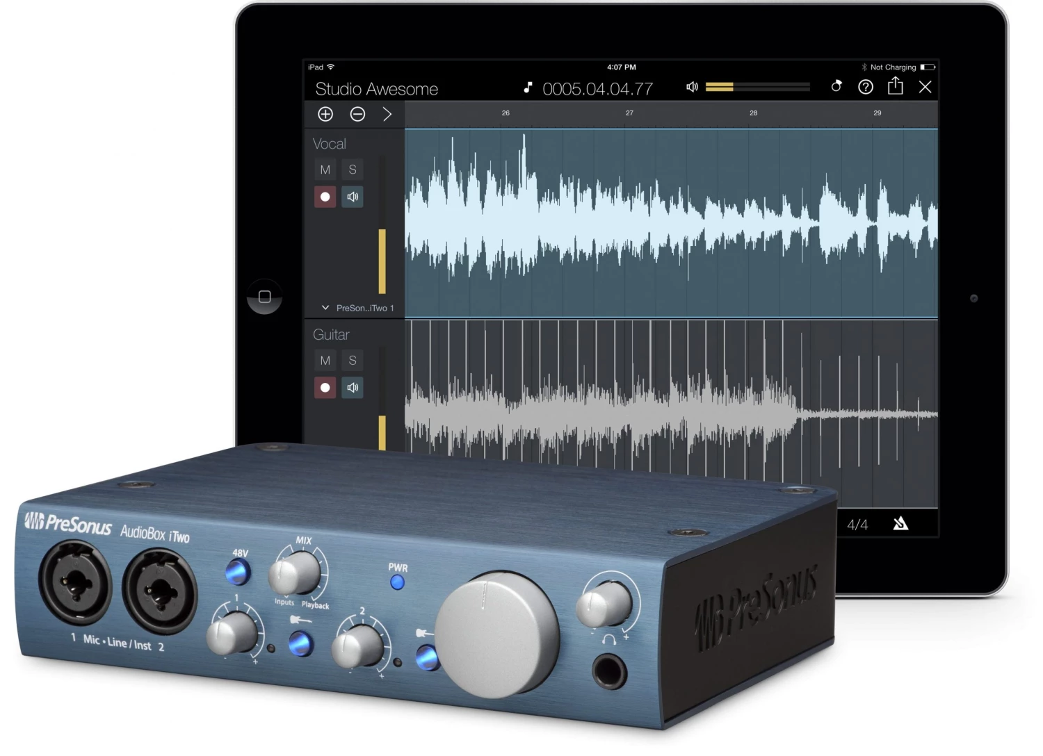An excellent choice for mobile musicians, sound designers, and podcasters, the USB 2.0 bus-powered PreSonus AudioBox® iTwo audio interface provides two combo mic and switchable line/instrument inputs with a high-performance mic preamplifier, so you can record synths, guitars, and anything you can capture with mics. MIDI I/O lets you connect your favorite synth or MIDI controller. The compact, ruggedly built AudioBox iTwo is compatible with Mac®, Windows® PC, and Apple iPad® and is bundled with powerful, easy-to-use recording software, making it a complete, multiplatform recording solution.