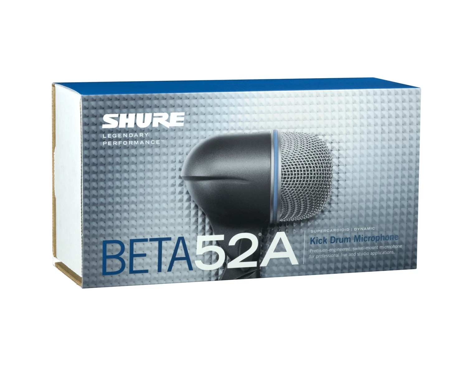 The Shure BETA®52A is a high output dynamic microphone with a tailored frequency response designed specifically for kick drums and other bass instruments. It provides superb attack and “punch”, and delivers studio quality sound even at extremely high sound pressure levels.Â