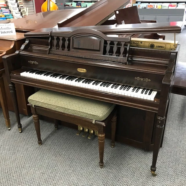 This Lowrey Console piano is in a dark wood finish. Manufactured in 1979, good overall condition with a few scuffs pretty typical for a piano of this age. The action is even and very smooth! You have to come by and try it for yourself.